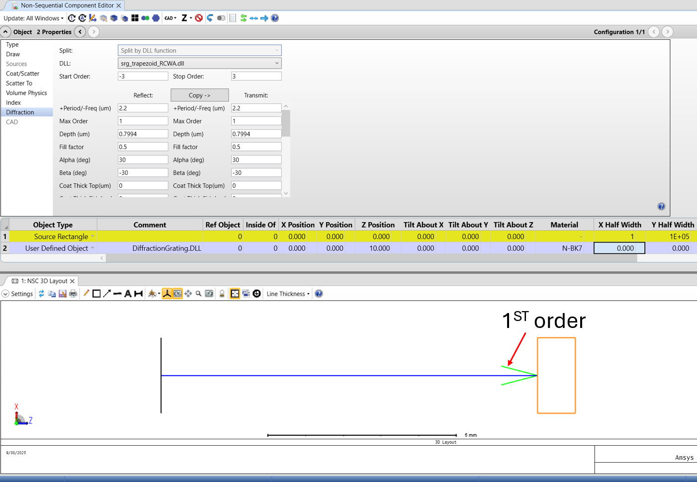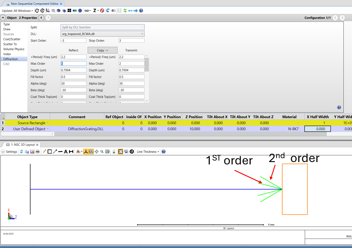 1. Start Order and Stop Order: Which harmonics are actually traced in your ray trace once "Split NSC Rays" is turned on and which orders are calculated by RCWA for the specific ray-tracing output.