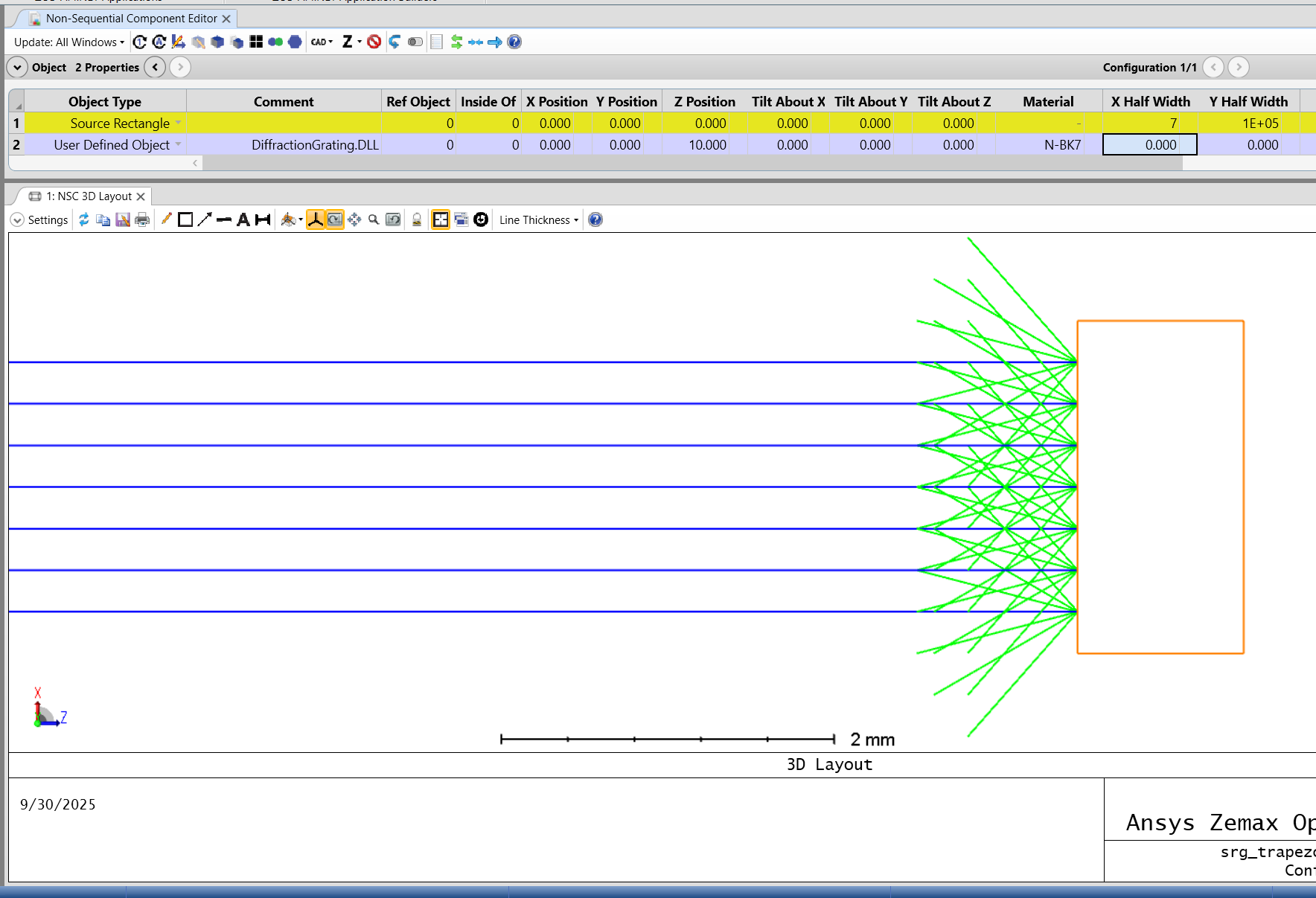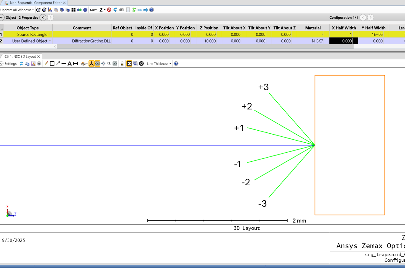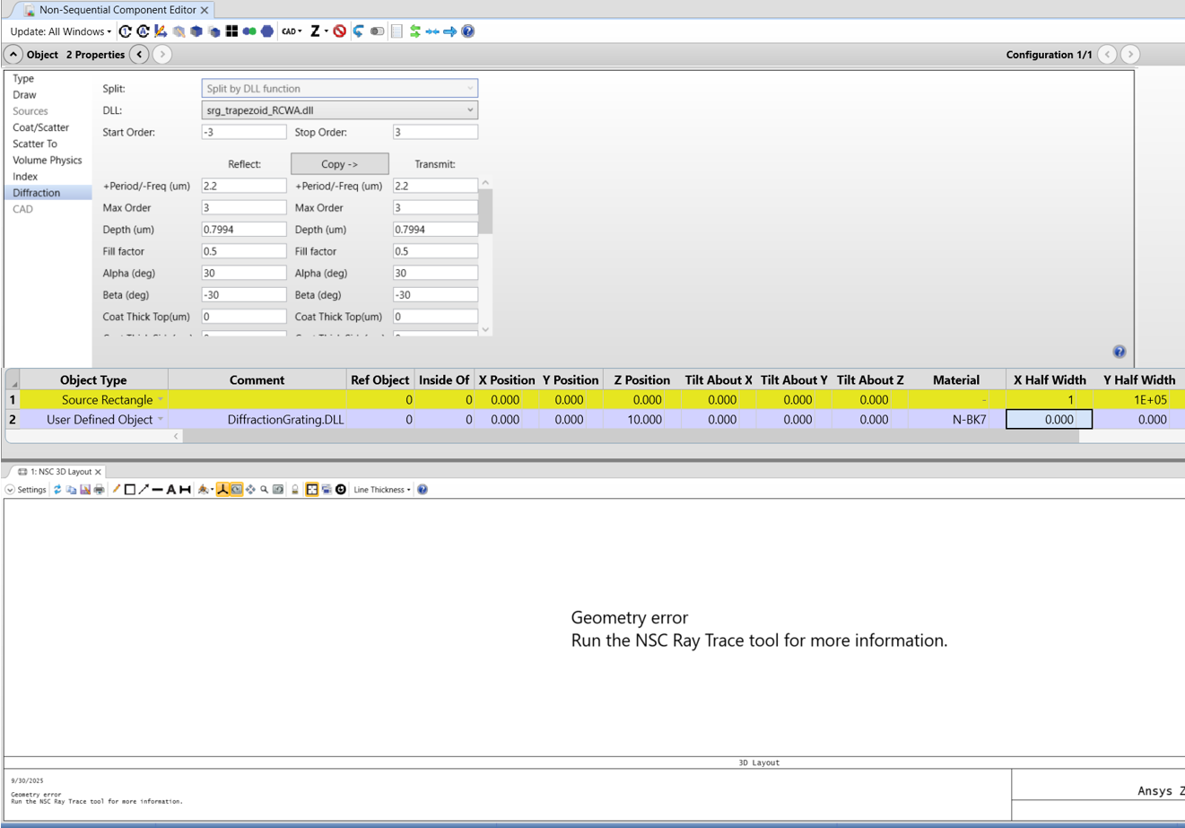 IMPORTANT: MOST LIKELY WILL SEE A GEOMETRY ERROR. THIS DOES NOT MEAN THE TRAPEZOID GRATING IS GEOMETRICALLY INCORRECT BECAUSE WE ALREADY CONFIRMED IT IN THE RCWA VISUALIZER. WHAT IS HAPPENING IS THERE ARE RAYS THE LAYOUT IS HAVING TROUBLE TRACING.